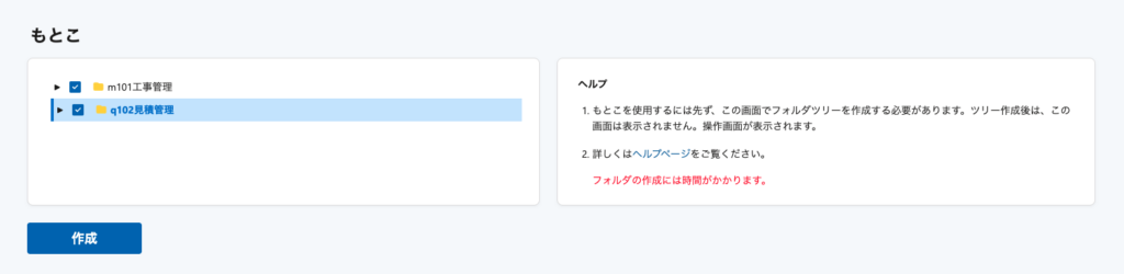 - 作成するフォルダにチェックを入れてください。「大工工事」「左官工事」等の専門工事名はここでチェックを入れておくことをお勧めします。 操作画面でも作成できますが、作成手間が省けます。