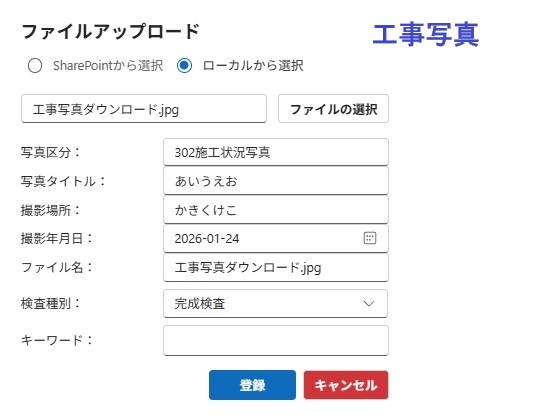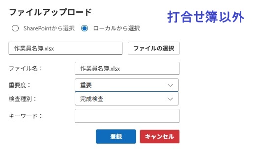 - 「ファイルアップロード」ダイアログはファイル用途により3種類あります。 即ち「打合せ簿」「打合せ簿以外」「工事写真」用です。