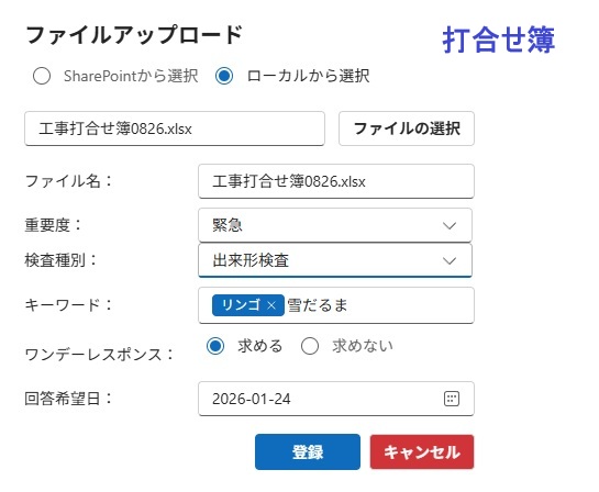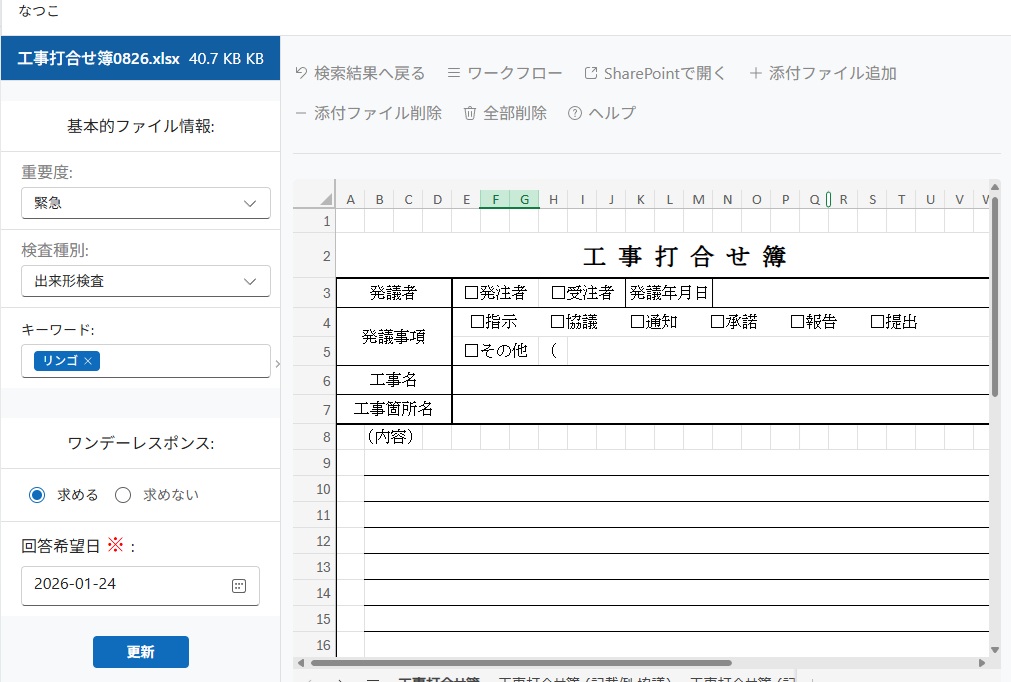 - 「工事打合せ簿」の場合、ワンデーレスポンス「求める」「求めない」があります。