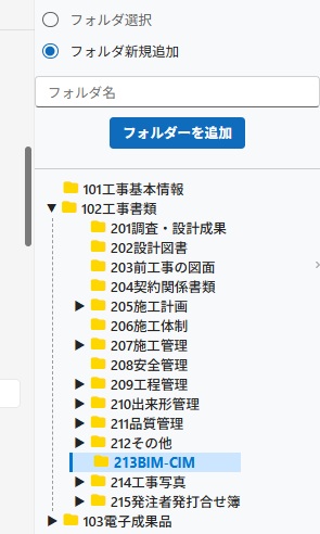 • 左図は 213BIM-CIMを選択した場合を示しています。 この下に新規フォルダが作成されます。