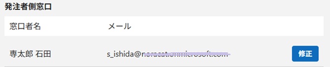 - 発注者側窓口者名が自動記入された名前と異なる場合、「修正」ボタンをクリックして訂正してください。