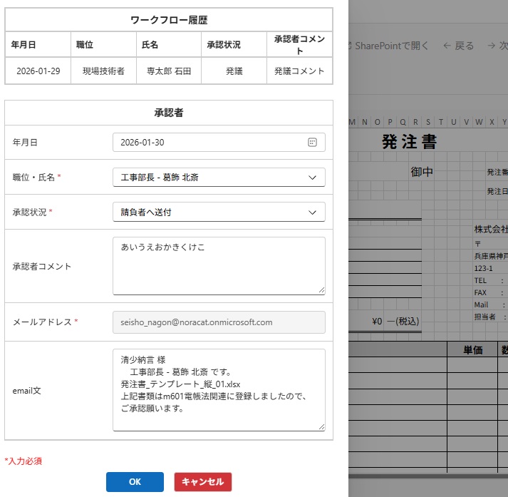 - 上段にはワークフロー履歴が表示されます。 この欄は編集できません。