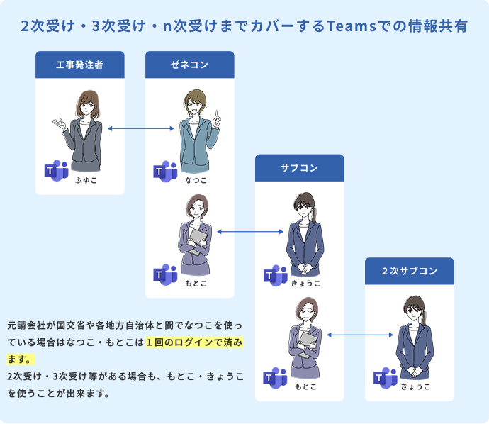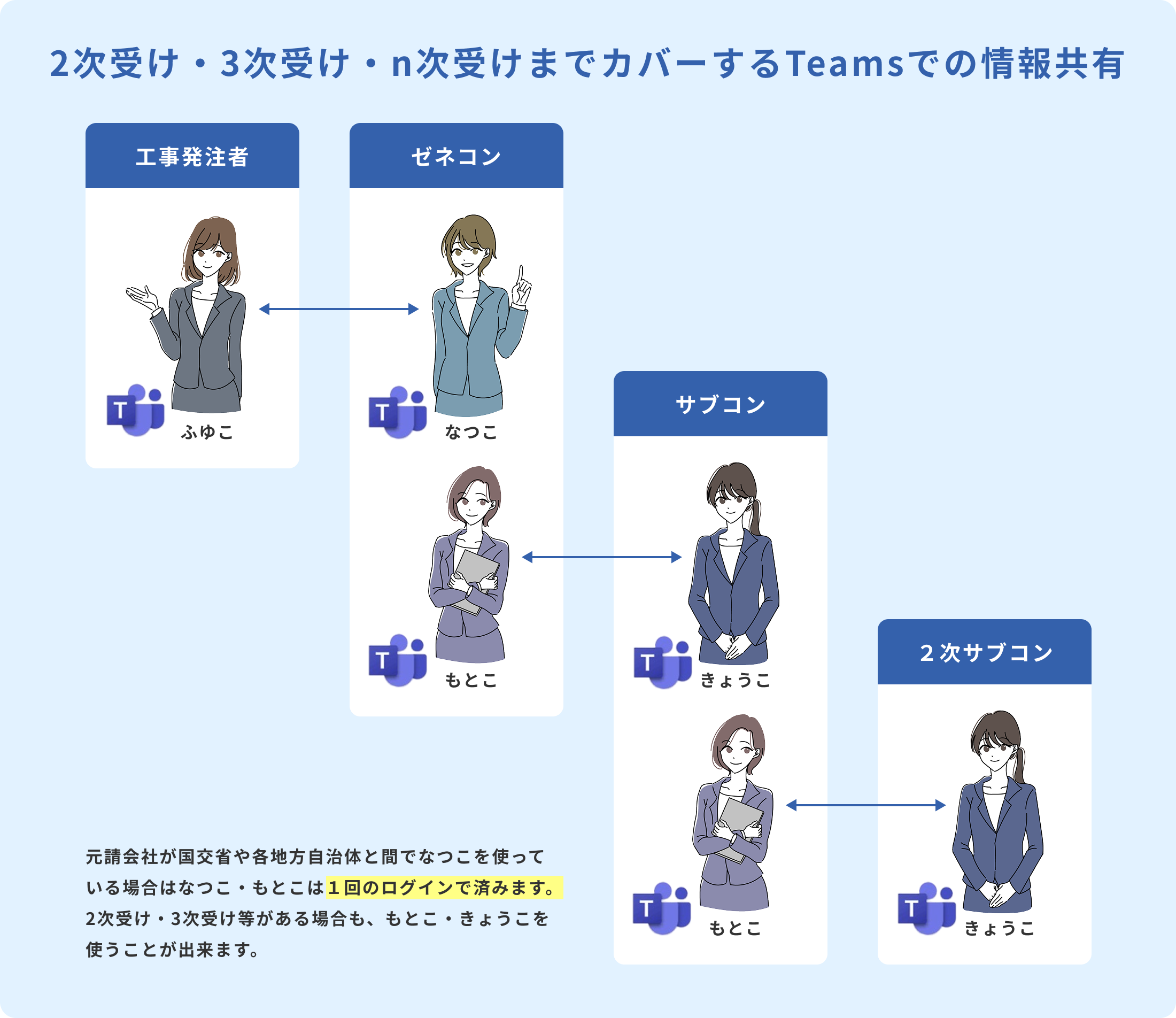 Teamsが持つ優れたファイル管理機能とコラボレーション機能は、元請会社・協力会社間の工事情報共有に最適です。