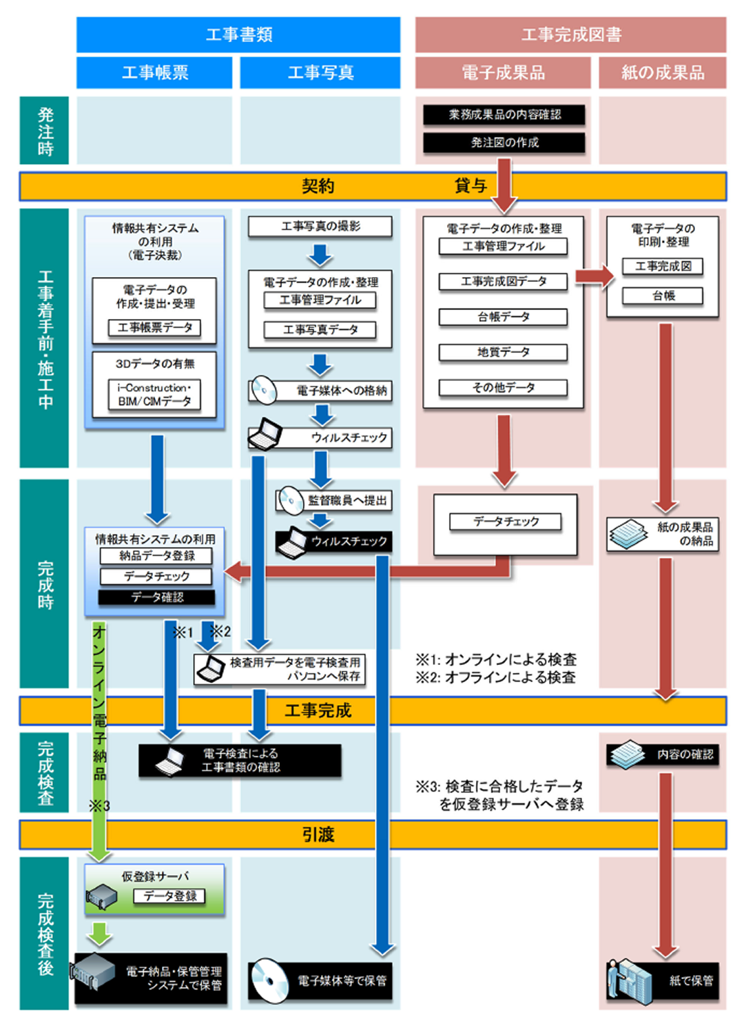- 工事書類ファイルはASP、成果品はローカルPCにあり、一旦仮登録サーバに転送して一括登録する必要がある